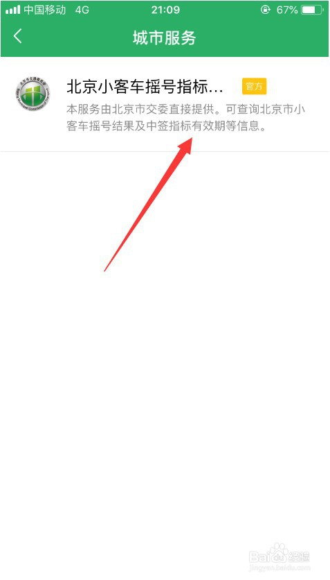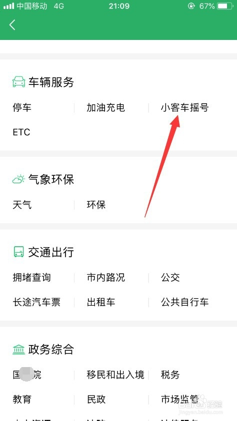 进入城市办事之后,找到车辆办事模块的“小客车摇号”,如图所示。