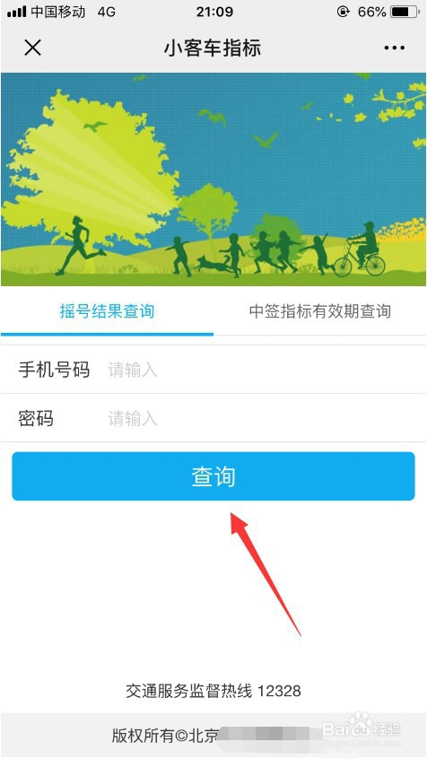 然后输入汽车摇号时注册的手机号和密码,点击下面的查询按钮就可以了,如图所示。