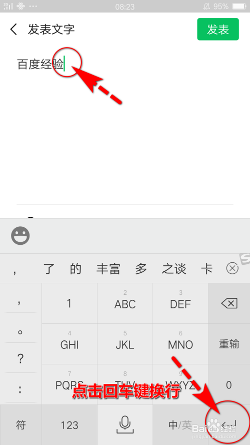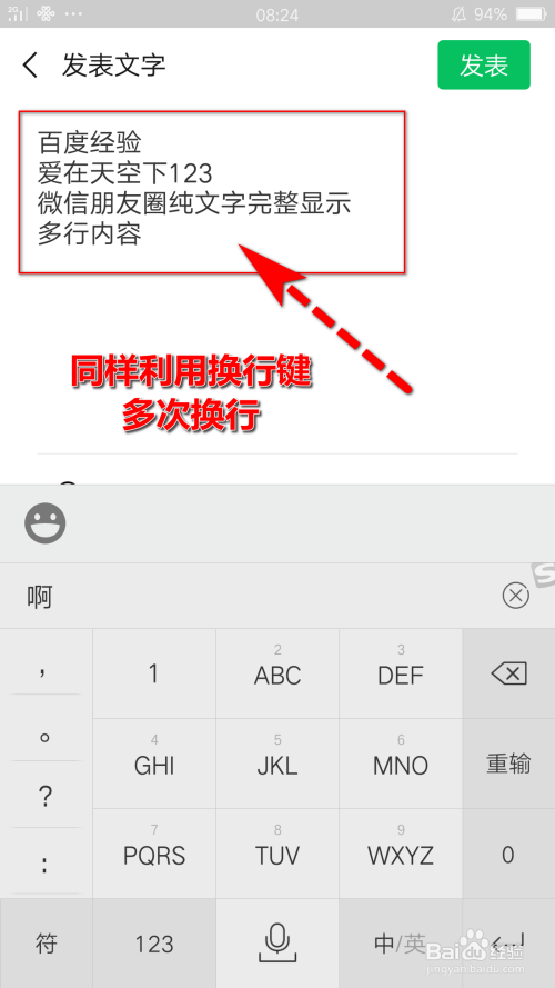 我们起头输入文字,这里注重下若是想要文字显示完整,我们就要操纵换行的输入方式来完当作,即给文字分段,输入一段文字后点击键盘上的回车换行,操纵这个方式多次换行输入完当作发布。