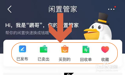 点击进入今后,在闲置管家本家儿界面最上方可以快速查看“已发布”、“已卖出”以及“买到的”等对应的商品;