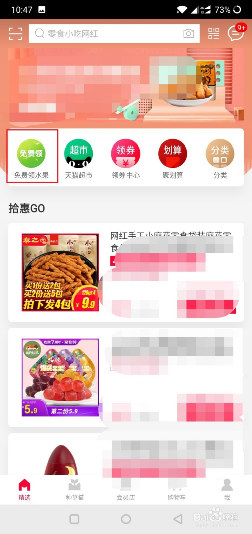 在天猫APP的本家儿界面中,可以看到第一个活动就是“免费领生果”