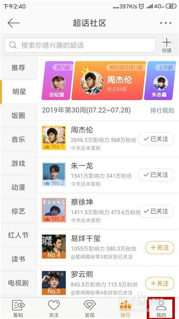 点击打开超话小我中间后可看到【存眷】,点击可打开存眷界面。