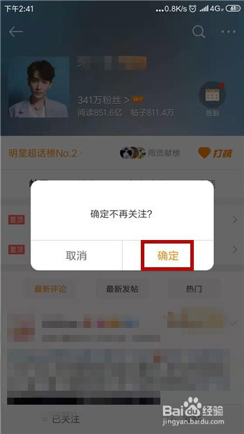 点击之后会扣问我们是否确定不再存眷,点击【确定】即可打消存眷。