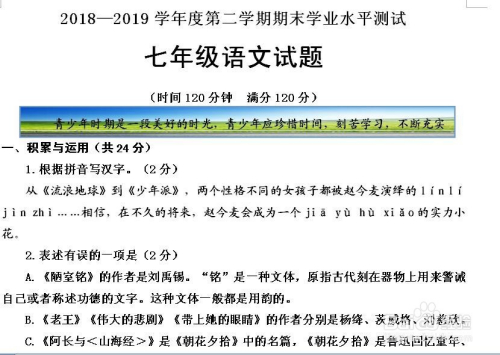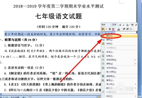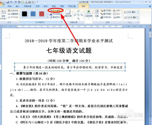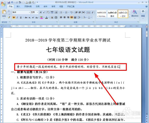 打开要进行美化处置的Word文档。要给试题前面的激励性说话添加上彩色布景。