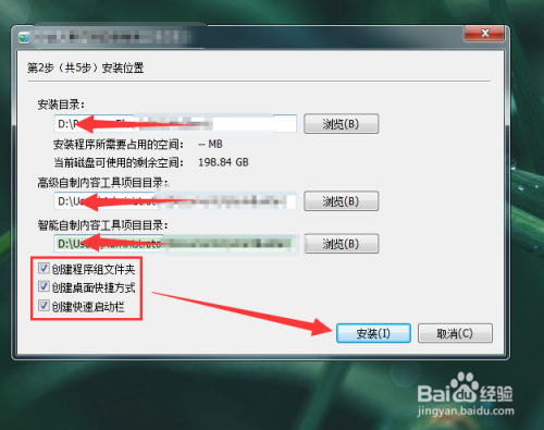 安装位置分为三项,将三项安装路径的首字母全数C改为D(不占用系统C盘空间),默认建立程序组、桌面快捷体例和快速启动栏文件夹,点击安装。