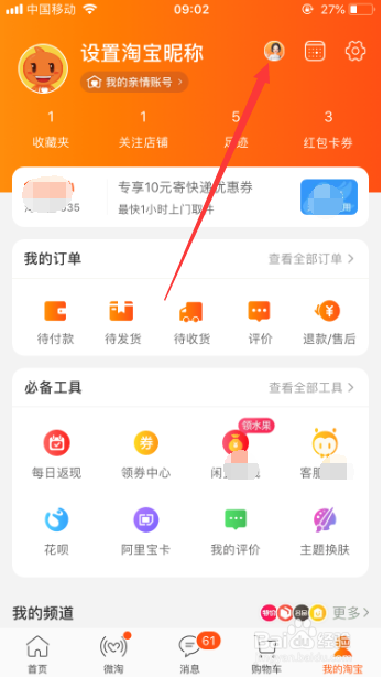 进入我的淘宝之后,点击页面上方的一个头像的按钮,如图所示。