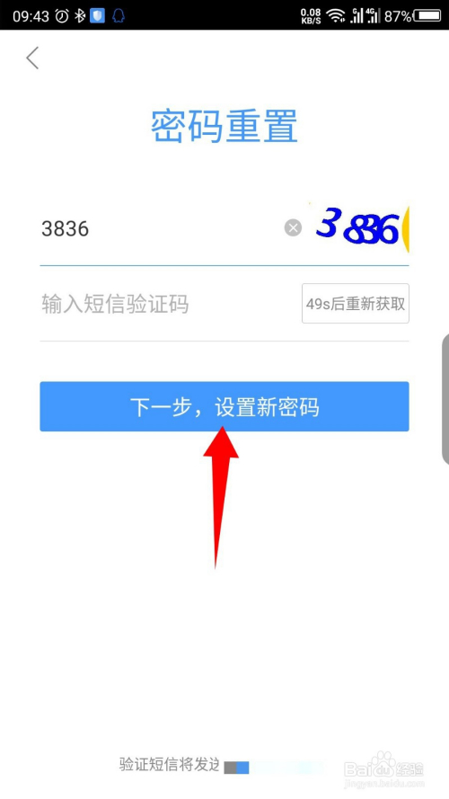 按照提醒输入数字,点击获取验证码。输入短信验证码,然后点击下一步,设置新密码。如图所示