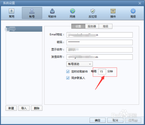 在账号Tab选项卡中,我们可以设置按时收取邮件的时候距离分钟数,如下图所示: