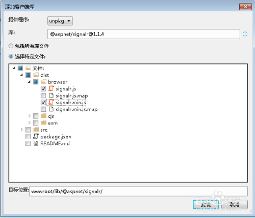 添加 SignalR 客户端库。选择项目右键“添加客户端库”,如下所示,在弹出的选择项中,选择“供给程序”:“unpkg”,0“库”:输入 @aspnet/signalr@1,选择最高的版本不变版本。然后文件选择SignalR.js和SignalR.min.js.