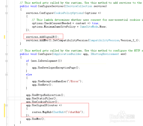 设置装备摆设 SignalR。在StartUp类里面设置装备摆设SignalR,本家儿如果设置装备摆设services和Config,如下所示,添加以下代码即可。