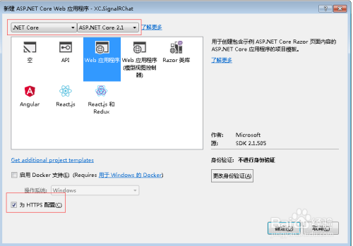 选择“.NET Core”方针框架,选择“ASP.NET Core 2.1”,因为我安装的是VS2017而且,默认的最高.Net Core版本为2.1,所以这里以2.1作为选择。
