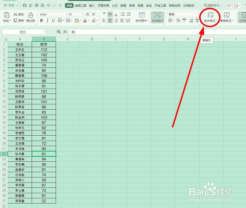 选中成就列地点的数据,找到菜单栏“前提格局”单击
