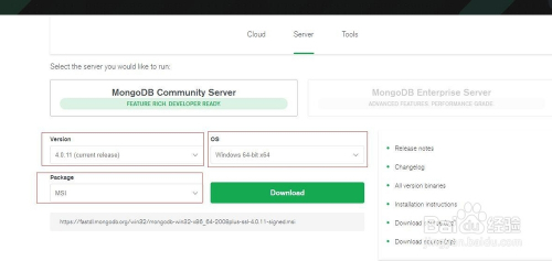 首先我们需要安装MongoDB,MongoDB的下载路径为https://www.mongodb.com/download-center/community?jmp=docs,如下图示,这里我们选择Windows版本