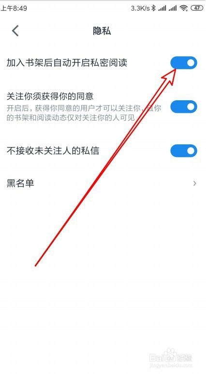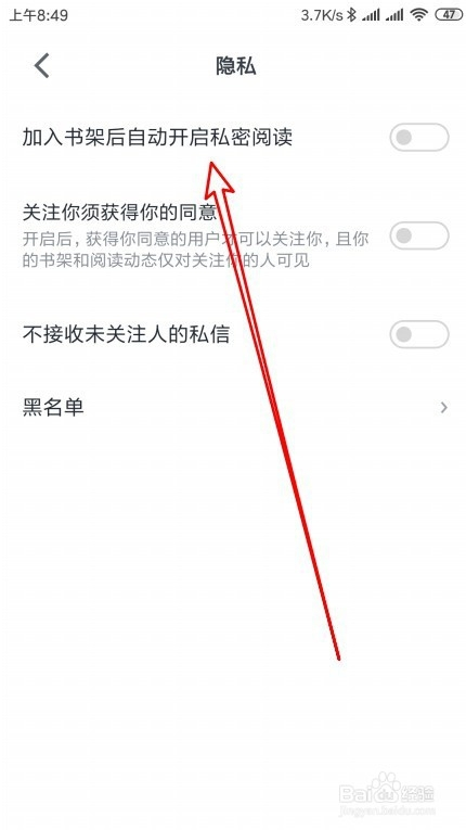 然后在打开隐私页面中找到插手书架后主动开启私密阅读的设置项