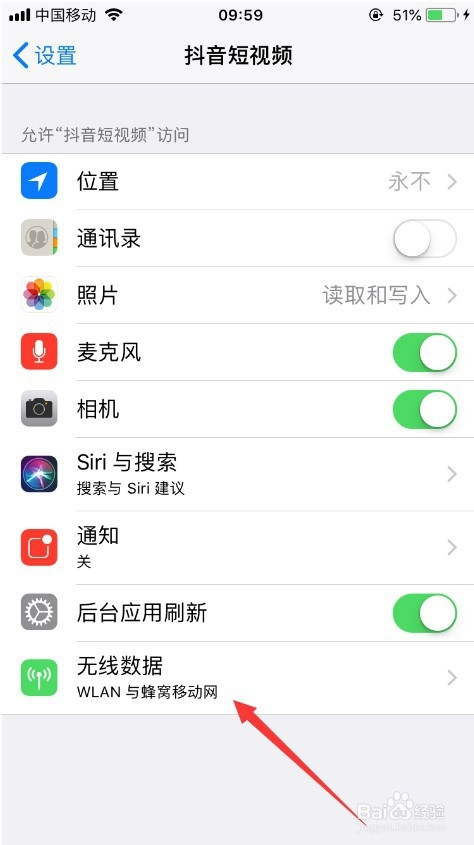 首先,先确定是不是收集原因导致抖音无法打开,可以进入手机的设置,然后找到手机对抖音的授权页,选择“无线数据”,如图所示。