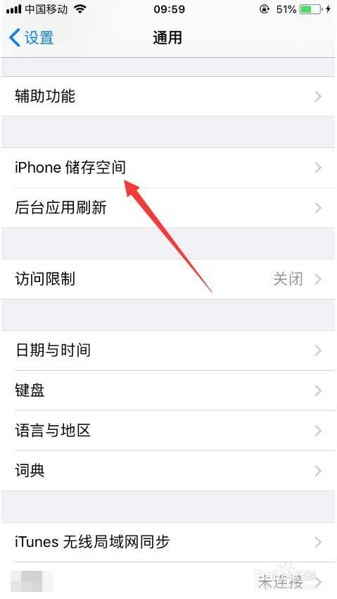 可以进入手机的“设置”,然后选择“iPhone存储空间”,如图所示。