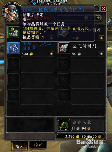 麦卡贡邦多的大杂院,坐标(63.42)有个叫柯克·斯塔加德的NPC出售一张“机械猫激光笔”图纸,采办这张图纸今后会接到一个使命,完当作使命奖励75点声望。