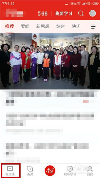 打开手机中的学习强国,在首页中点击左下角的【强国通】功能。