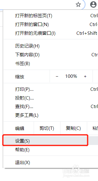 打开谷歌浏览器,点击右上方的按钮,如图所示,再点击下拉列表的设置按钮,进入设置界面。