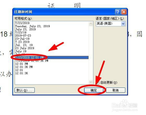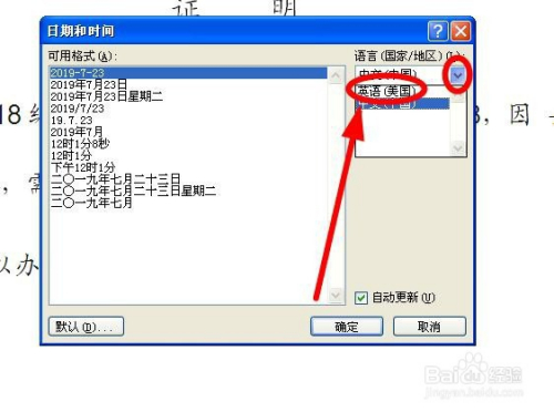 若是需要插入的日期是英文日期,可以在“日期和时候”对话框中的“说话(国度/地域)”下面单击下拉箭头,鄙人拉菜单选择“英语(美国)”