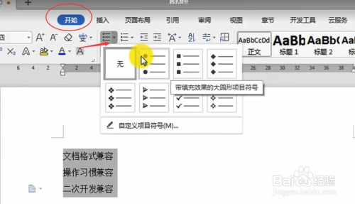 在起头选项卡下,选择项目符号,打开下拉框,在这里有几种项目符号可供选择,我们可以选择喜好的那一个,