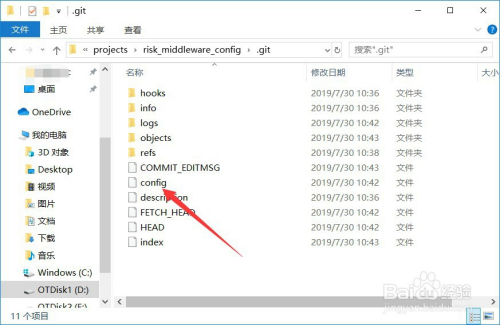 找到.git文件夹之后,点击进入,找到此中的“config”文件,也就是git的设置装备摆设文件,如图所示。