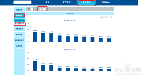 第三,同样的指数行业那边点击:在各指数分布——在行业选择那边选择你想要领会哪一个行业的指数就点击右侧的下拉选项去选择——下方的图表就会主动显示前10的指数。