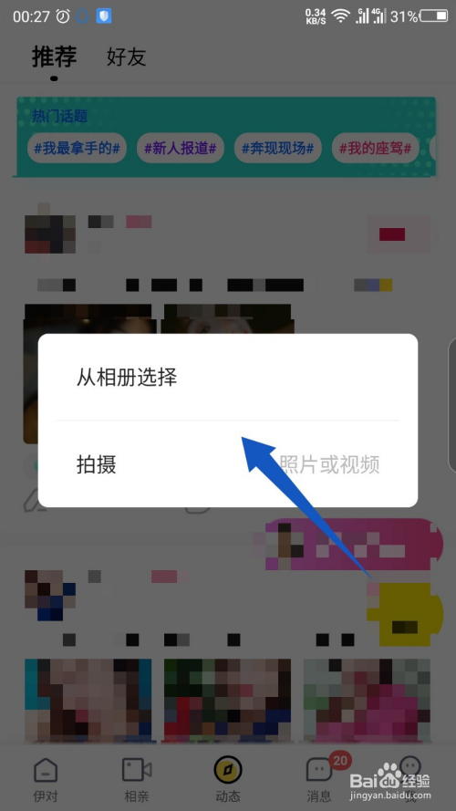 在弹出的窗口中,选择从相册选择或者是拍摄照片视频。如图所示
