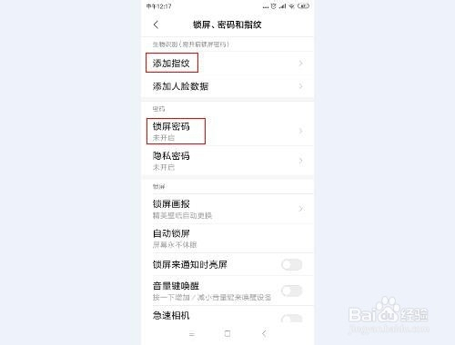 这里有“添加指纹”和“锁屏密码”。随意打开一个。