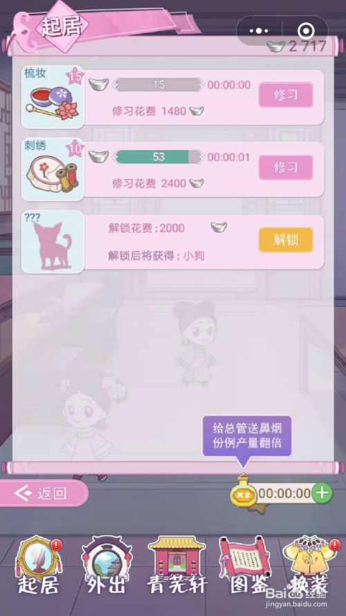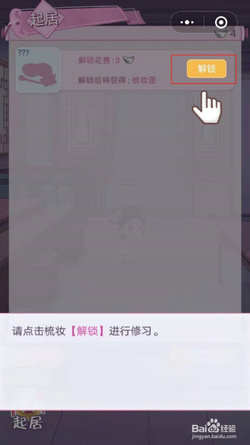 然后点击左下角的“起居”进行打扮,我们首先要破费3银两解锁打扮匣