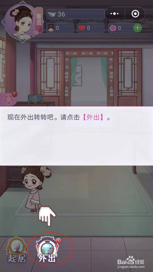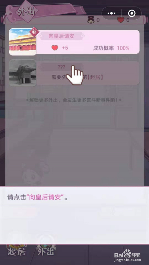 解锁今后我们此刻就可以外出了,点击下面的“外出”,点击“标的目的皇后存候”
