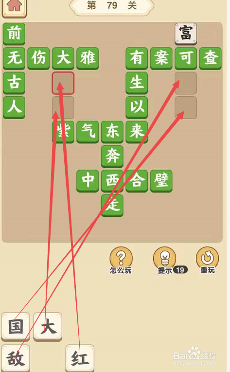 将“红”字填在“大”字下面,将“大”字填在“红”字下面,构成当作语“大红大紫“,然后将“敌”字填在“可”字下面,将“国”字填在“敌”字下面,构成当作语“金玉满堂”。