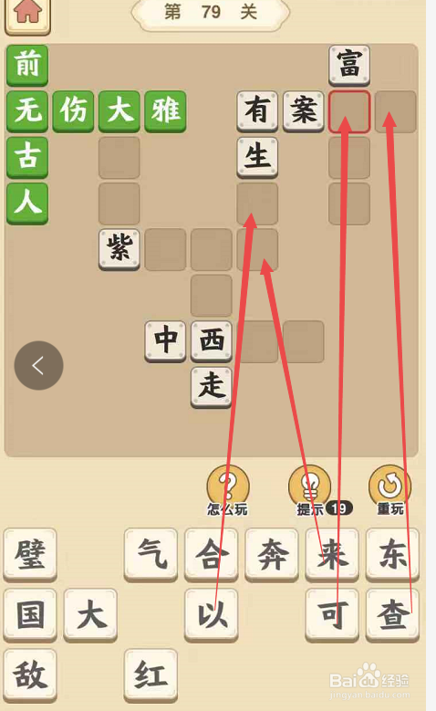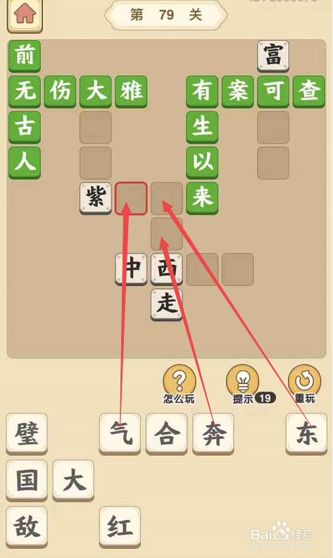 将“气”字填在“紫”字后面,将“东”字填在“来”字前面,构成当作语“紫气东来”,然后将“奔”字填在“西”字上面的空格内,构成当作语“到处奔跑”。