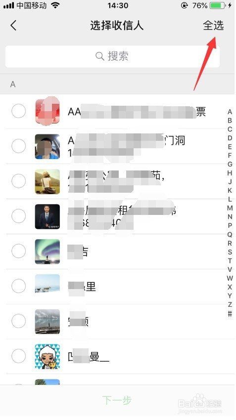 然后需要选择收信人,可以选择动静的接收老友,也可以点击右上角的“全选”,然后点击“下一步”,如图所示。