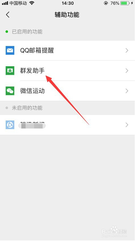 进入辅助功能之后,选择已开启功能中的“群发助手”,点击进入,如图所示。