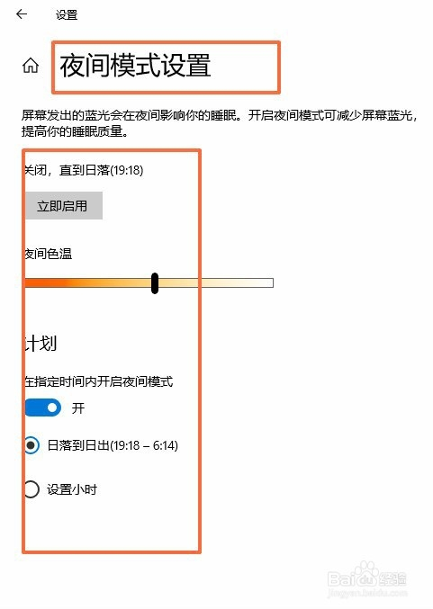 这时就可以看到夜间模式设置页面,我们按照需要进行设置;