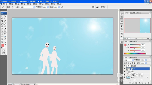 选择自界说外形,设置前景色为白色,绘制人物外形图形,新建图层,画笔东西设置颜色为黑色,点击调整人物的眼睛,这样蓝色的天空就设计好了。