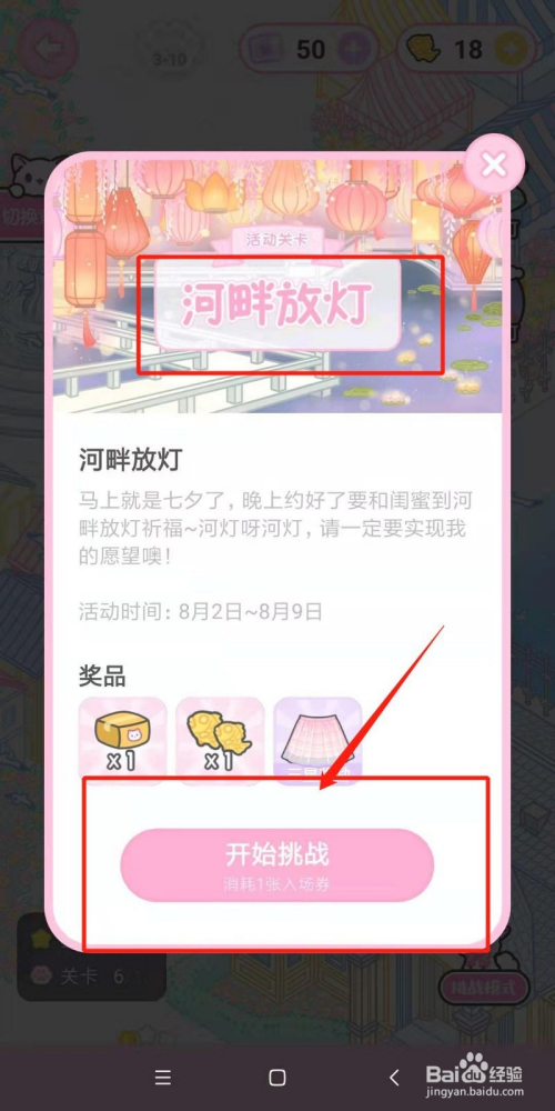 进入装扮少女剧情模式,进入挑战活动关卡:河畔放灯