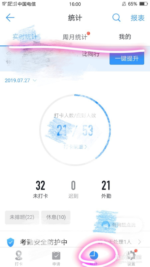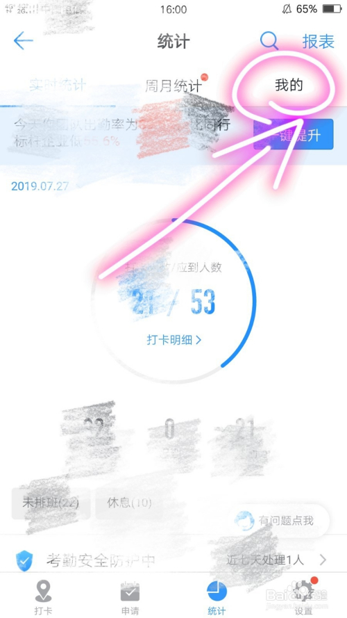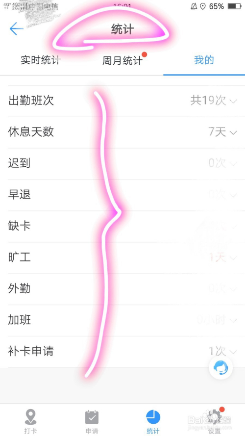 此时,我们可以在打开的我的页面中看到小我的考勤环境,如:出勤天数、班次、迟到、早退等等,经由过程滑动该页面;