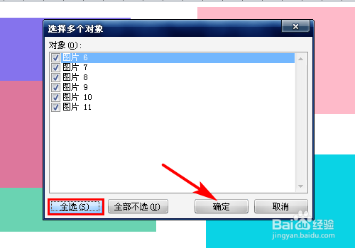 然后,单击左上角的“选择多个对象”按钮,在打开的“选择多个对象”对话框中就列出了该文档中所有的图片,单击【全选】按钮,最后单击【确定】按钮封闭对话框。