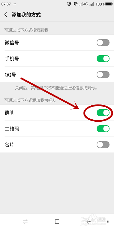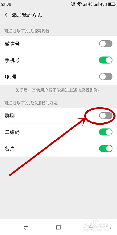 在打开的“添加我的体例”页面,有两组设置按钮:“可经由过程以下体例搜刮到我”和“可经由过程以下体例添加我为老友”。我们在第二个选项组下找到“群聊”,可以看到此刻它是绿色,这就是本身莫名其妙被别人拉进群聊的原因