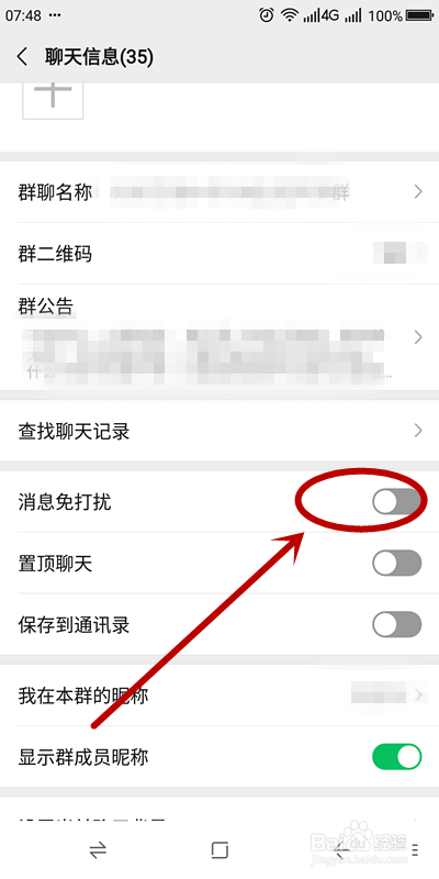 在“聊天信息”页面,下滑找到“信息免打搅”单击,封闭该功能即可