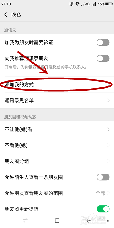 在“隐私”页面找到“添加我的体例”单击,打开新页面