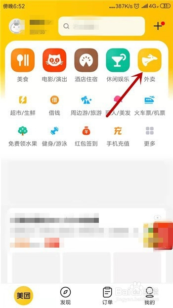 点击打开美团,在美团中点击顶部门类中的【外卖】。