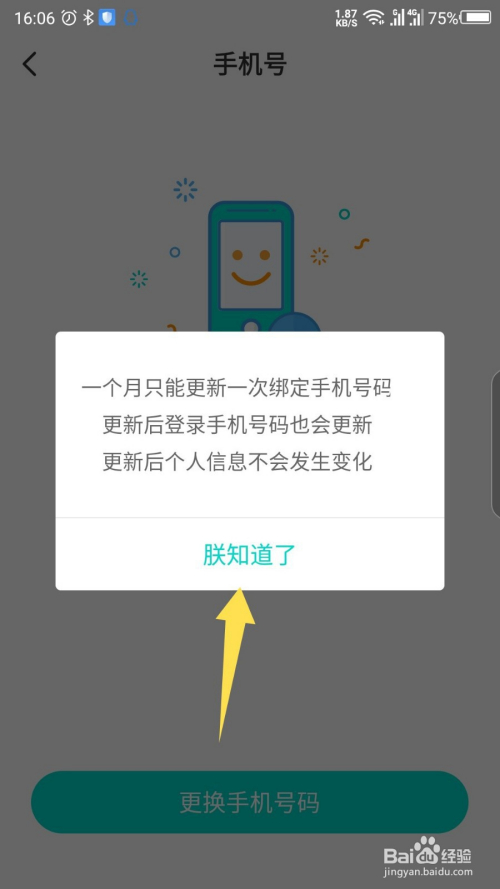 会弹出一个窗口,一个月只能更新一次绑定手机号码,点击知道了。如图所示