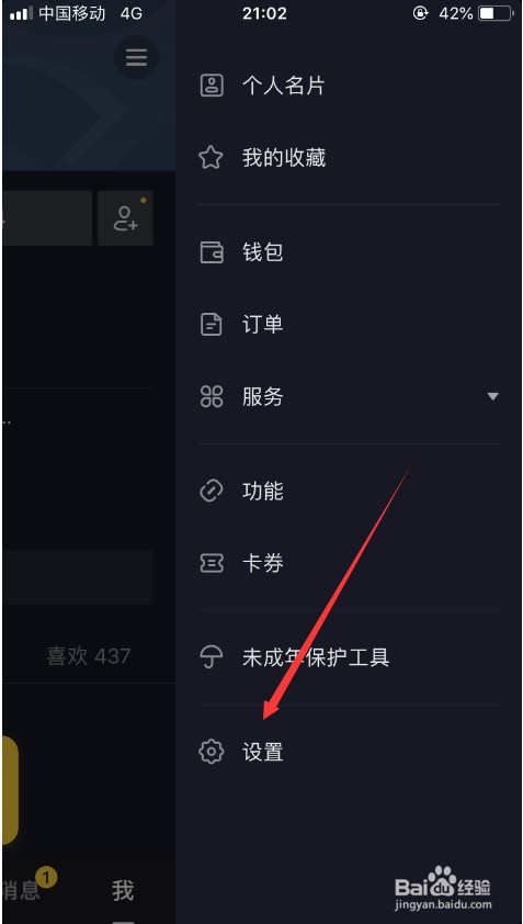 然后会从右侧弹出一个菜单列表,我们选择此中的“设置”,如图所示。