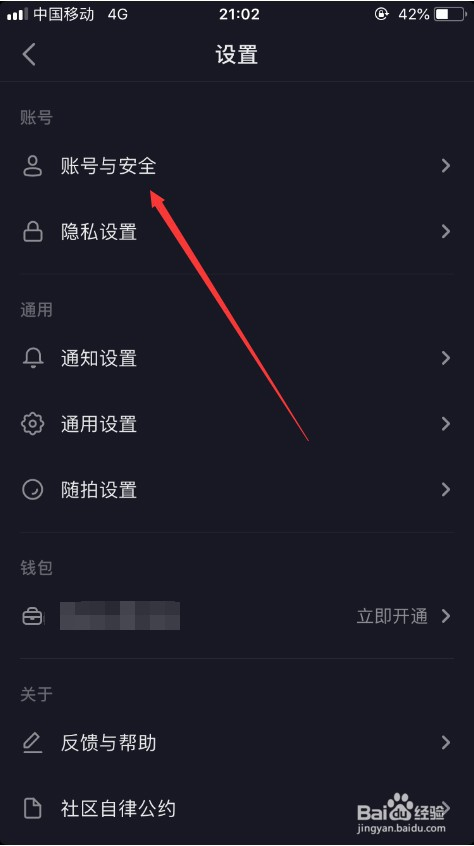进入抖音的设置功能之后,选择上面的“帐号与平安”,如图所示。