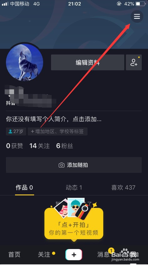 进入抖音的小我本家儿页之后,点击右上角的“三个杠”按钮,如图所示。