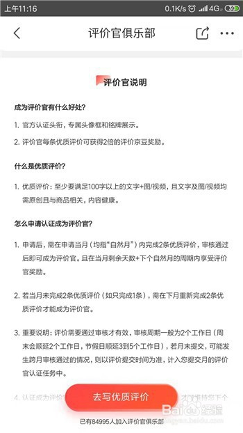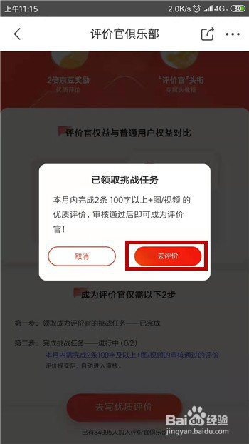 领取后可看到使命是在本月完当作两条则字+视频/图片的评价,点击【去评价】选项。