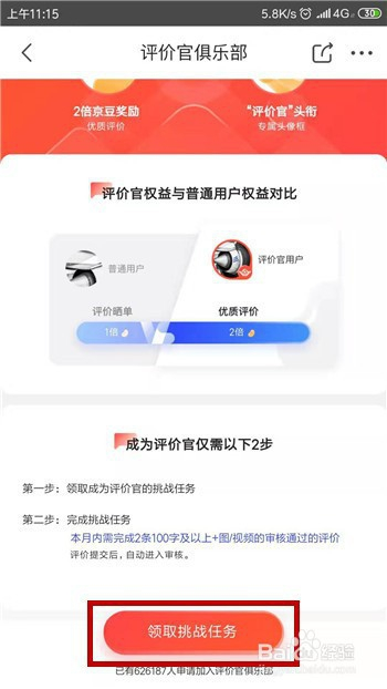 申请当作为评价官需要两个步调,首先需要接取使命,点击【领取挑战使命】。